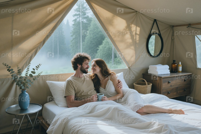 Взрослая пара отдыхает в шатре Glamping во время романтического путешествия