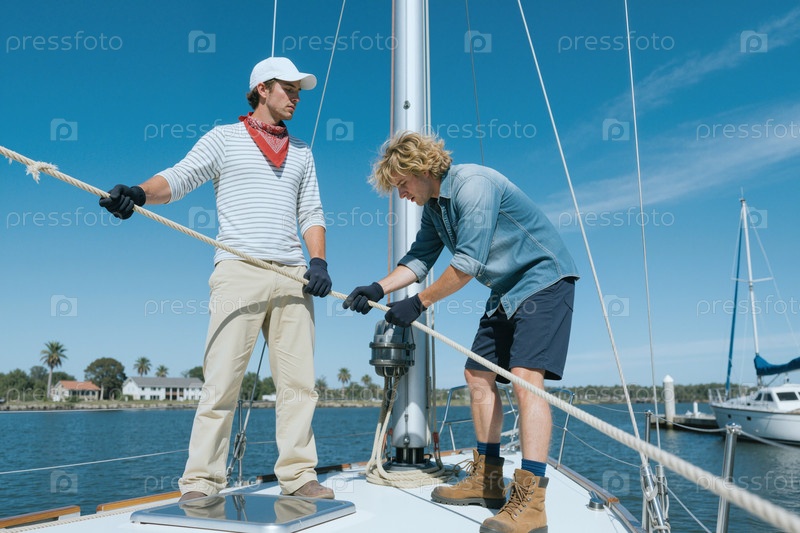 Мужчины-взрослые, готовящие парусное судно для морских путешествий
