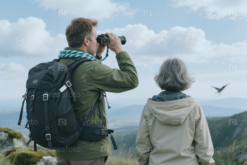 Взрослый мужчина наблюдает за птицами со старшей женщиной во время горного похода