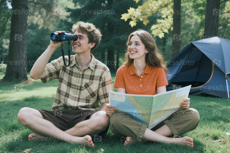 Adult Couple Camping and Planning Outdoor Travel Adventure для взрослых пар и планирование приключений на открытом воздухе