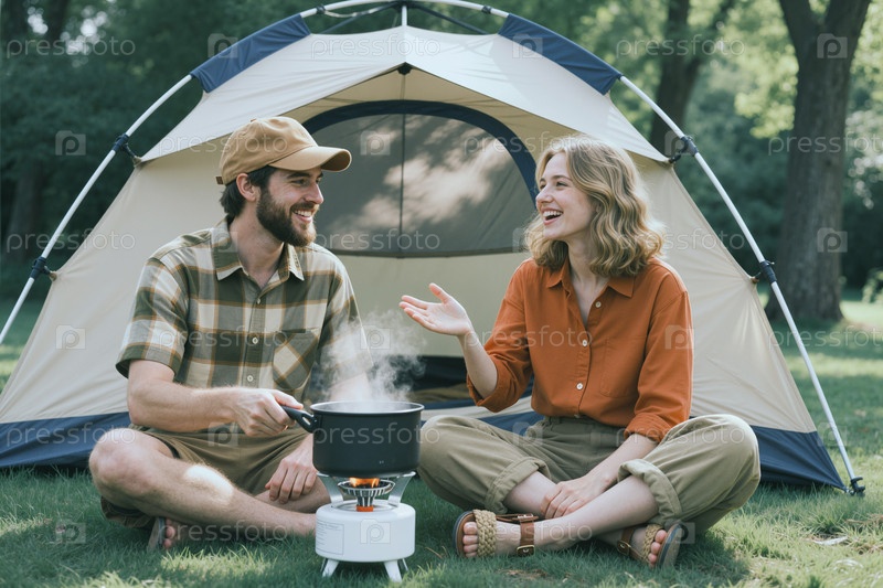 Взрослая пара готовит еду во время кемпинга для маркетинга отдыха на открытом воздухе
