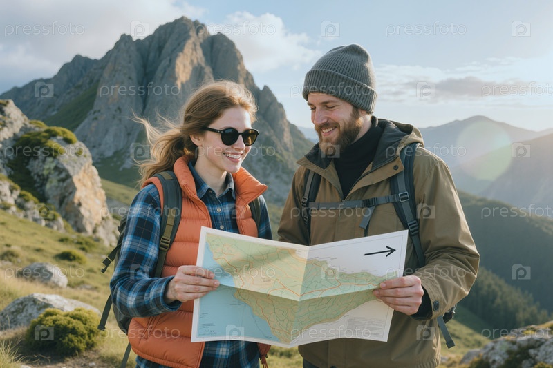 Взрослые пары походы и чтение карты во время горного путешествия
