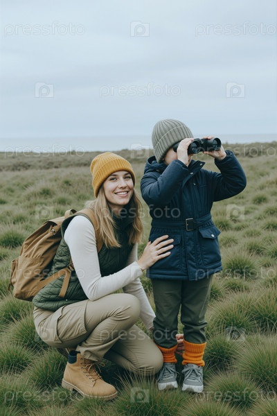 Портрет женщины, путешествующей с ребенком, наблюдающей за птицами в природе