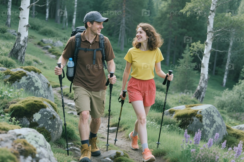Взрослые пары ходят по лесной тропе, поощряя активный образ жизни