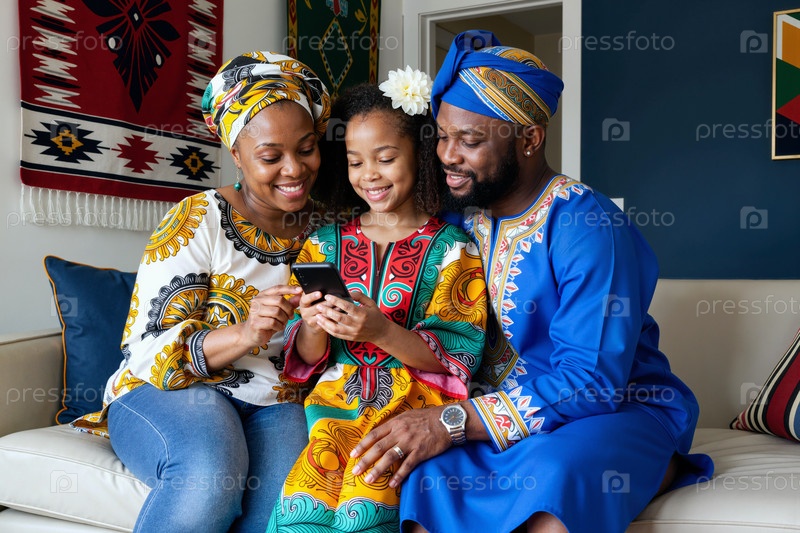 Черная семья использует смартфон вместе для цифровой коммуникации
