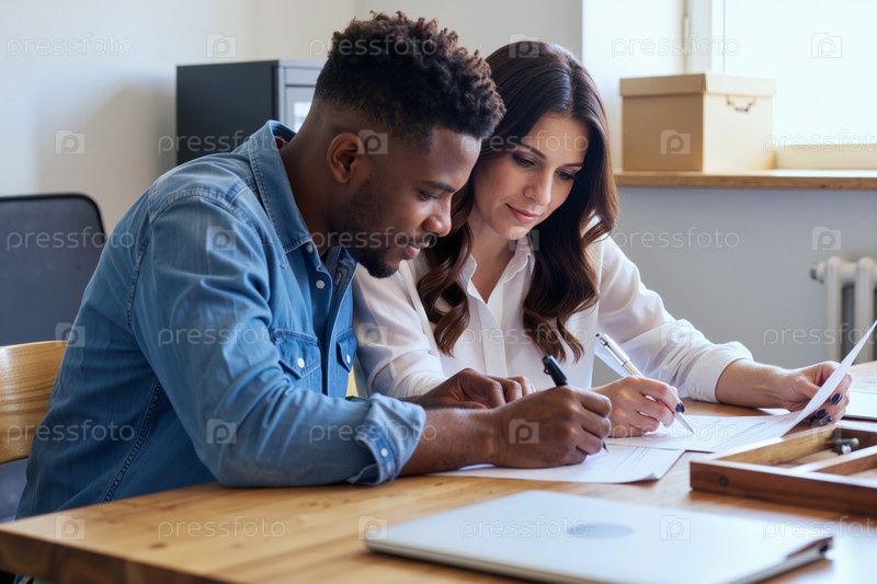 Чернокожий мужчина и взрослая женщина просматривают документы для покупки дома