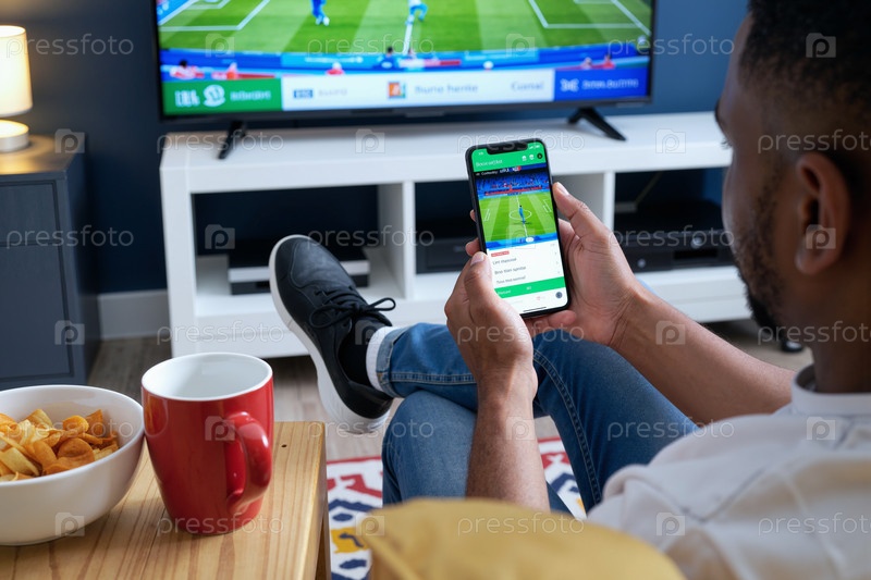 Молодой взрослый чернокожий мужчина смотрит футбольный матч, используя приложение для ставок на смартфоны