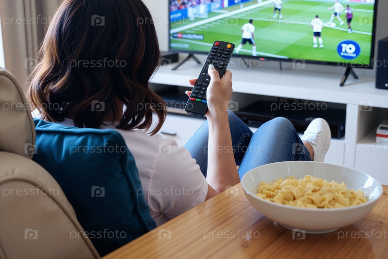 Молодая взрослая белая женщина смотрит футбольный матч по телевизору отдыхает дома