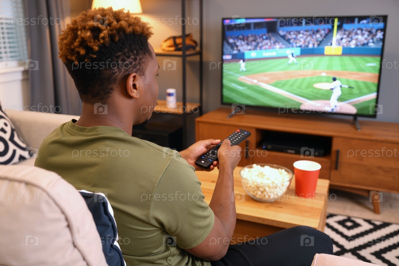Молодой чернокожий мужчина смотрит бейсбольный матч по телевизору, держа дистанционное
