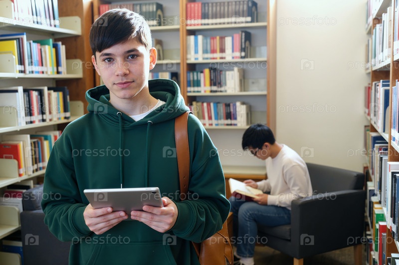 Портрет белого мальчика-подростка, использующего цифровой планшет в библиотеке