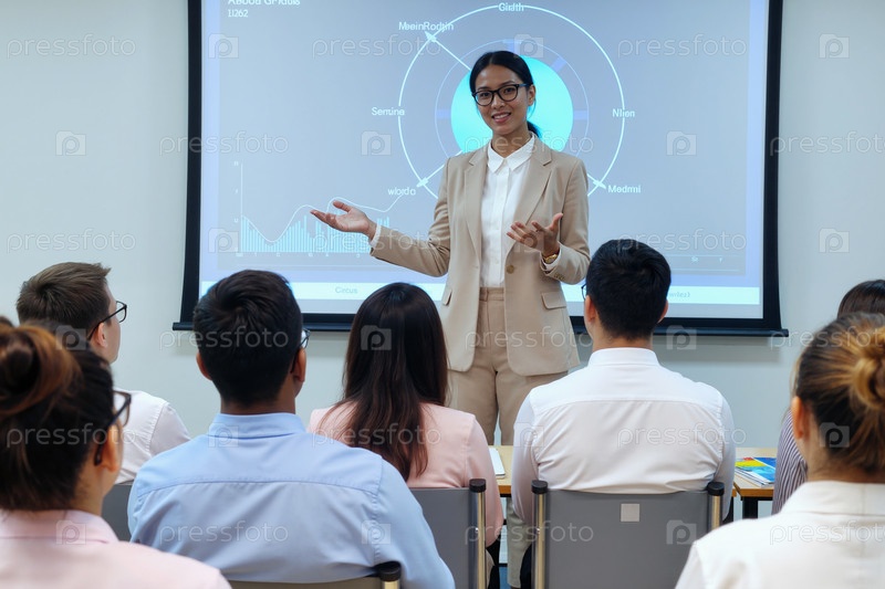 Молодая взрослая азиатская женщина дает бизнес-презентацию для мультиэтнической аудитории