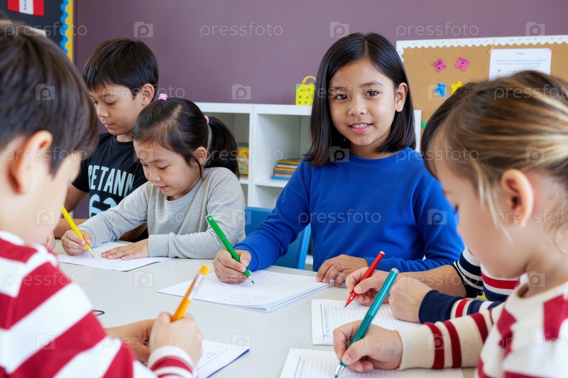 Группа разнообразных детей, сотрудничающих над школьной работой в классной обстановке