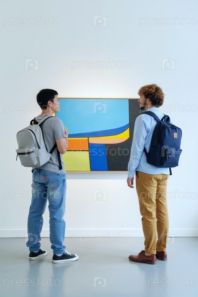 Вертикаль молодых взрослых мужчин, наблюдающих абстрактную живопись в галерее современного искусства