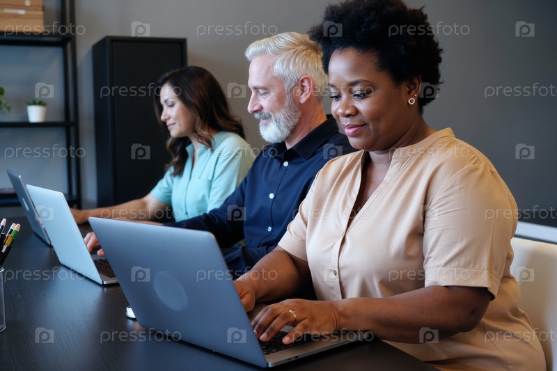 Мультиэтнические коллеги среднего возраста, сотрудничающие на ноутбуках в офисной рабочей зоне