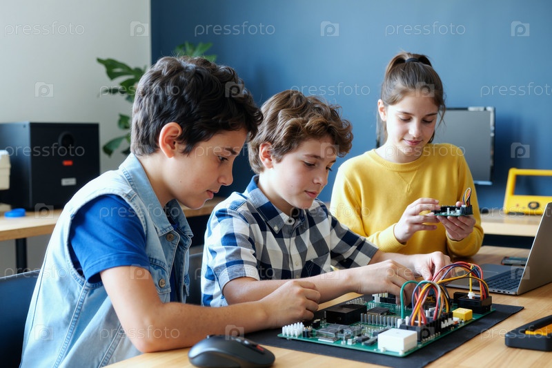 Мальчики и девочки-подростки сотрудничают над проектом по робототехнике в классной обстановке