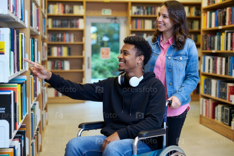 Молодая белая женщина помогает молодому чернокожему мужчине с инвалидностью в выборе книг