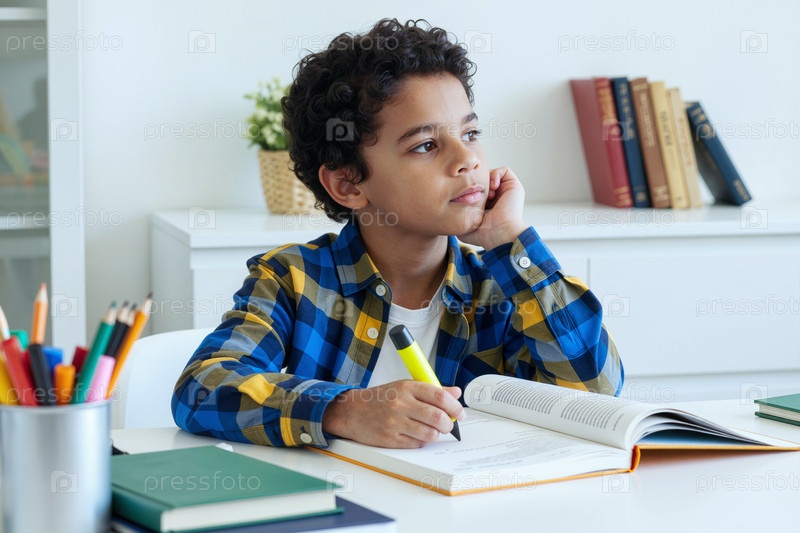 Кавказский мальчик думает, изучая за столом с книгами и канцелярскими принадлежностями