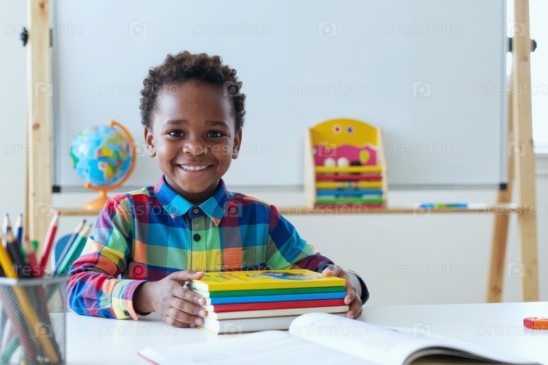Портрет чернокожего мальчика, улыбающегося в то время как он держит книги в классе