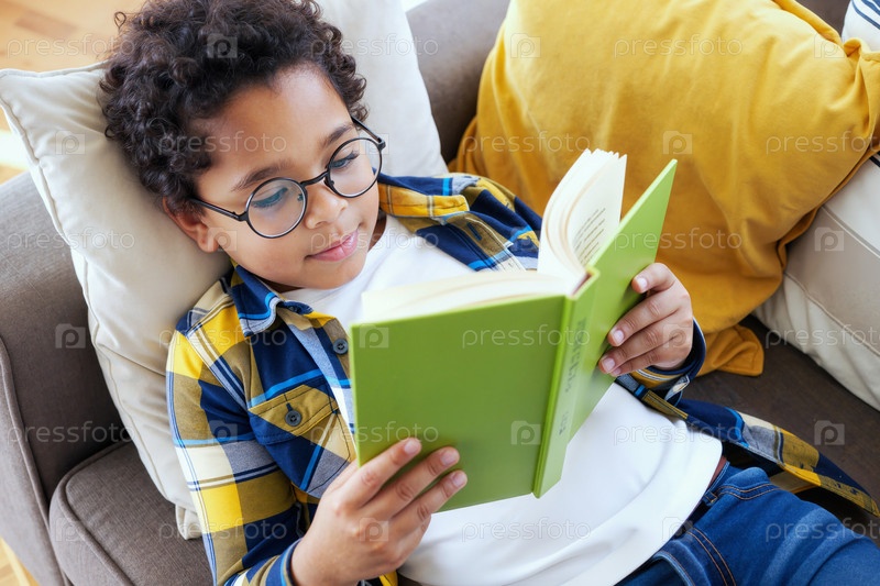 Претиенный чернокожий мальчик, отдыхающий на диване Читать книгу с сосредоточенным выражением