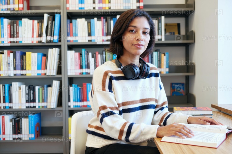Портрет молодой взрослой испаноязычной женщины, изучающей в библиотеке и смотрящей на камеру