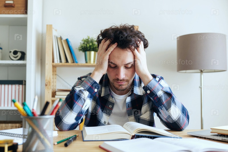Молодой белый мужчина учится за столом, чувствуя себя напряженным и подавленным