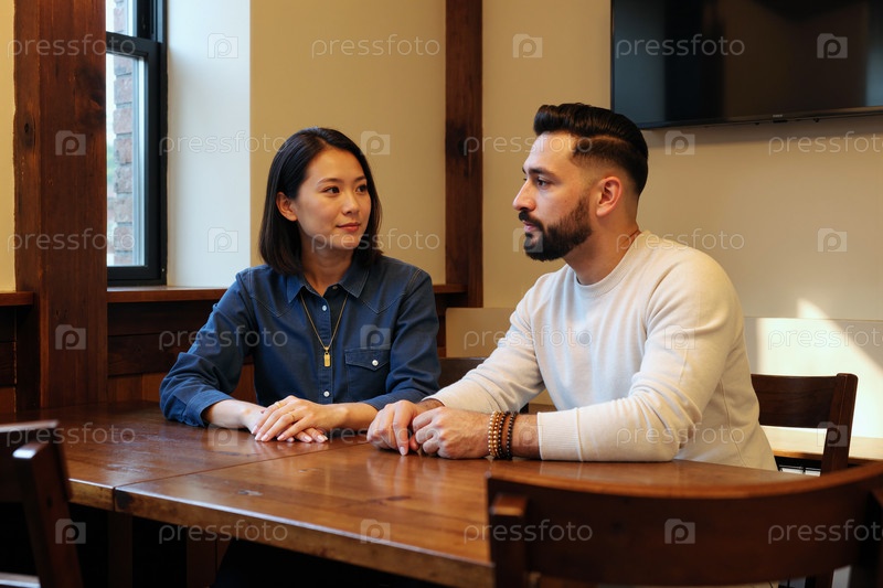 Молодая азиатская женщина и молодой белый мужчина ведут серьезный разговор в помещении