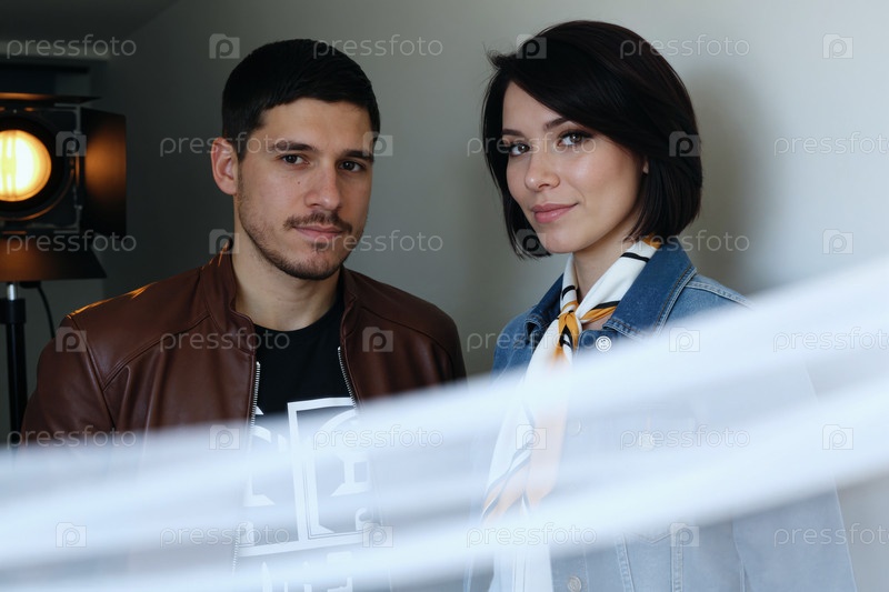 Портрет молодого белого мужчины и молодой белой женщины, стоящих в помещении