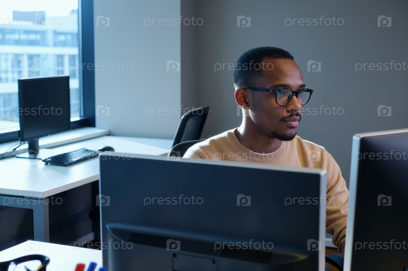 Черный мужчина работает на компьютере в офисе для корпоративных технологий