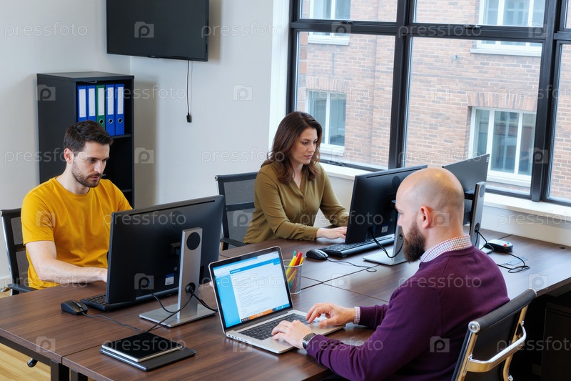 Офисная команда, работающая на компьютерах в совместном рабочем месте