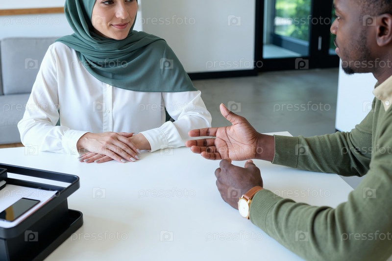 Чернокожий мужчина интервьюирует мусульманскую женщину на инклюзивном рабочем месте