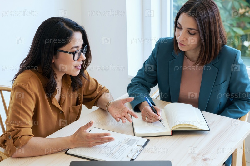 Деловые женщины-взрослые обсуждают документы во время офисной встречи