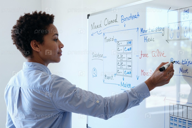 Деловая женщина пишет стратегию на доске в офисе