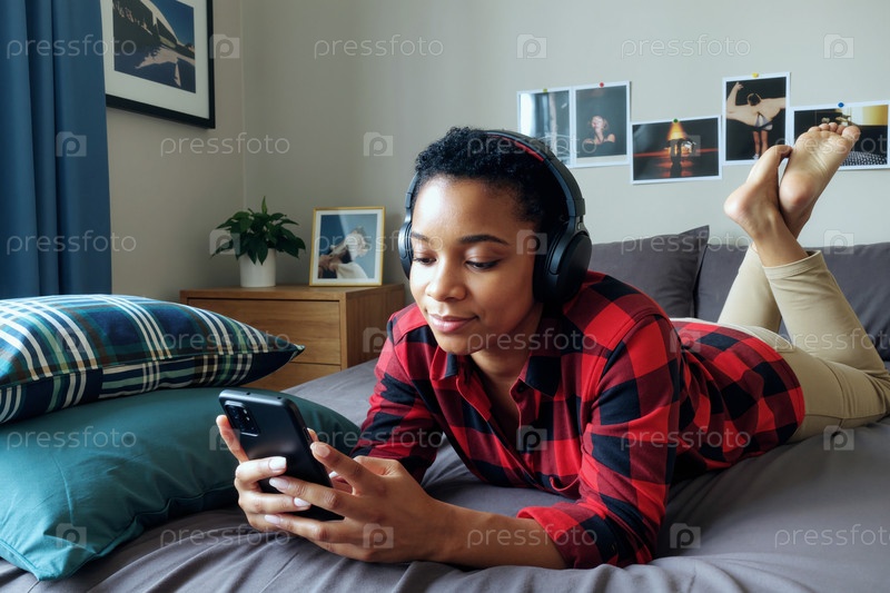 Черная женщина слушает аудио на смартфоне для домашнего отдыха