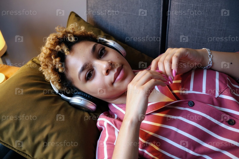Портрет взрослой женщины, расслабляющейся с наушниками для самообслуживания
