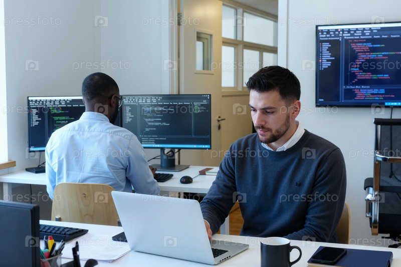Разработчики программного обеспечения, работающие над проектом кодирования в современном офисе