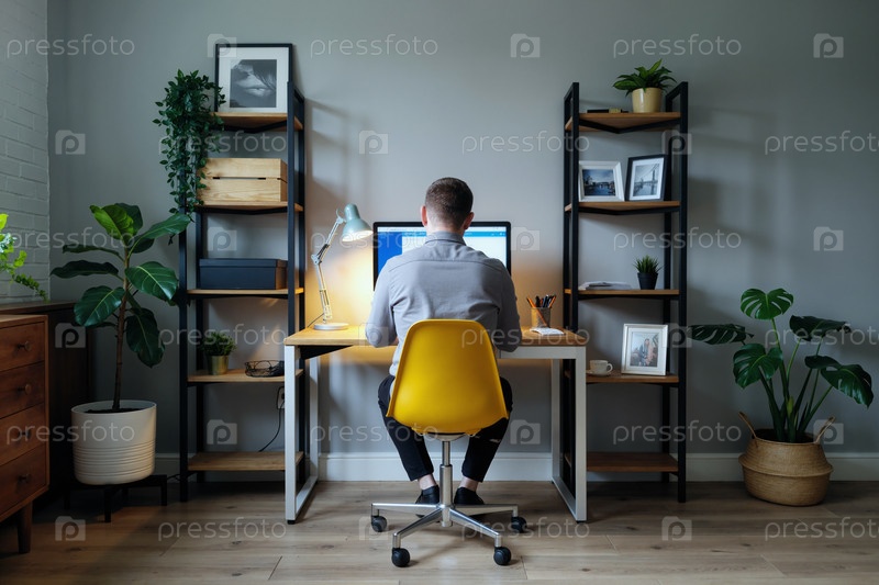 Взрослый мужчина, работающий на домашнем офисе Компьютер в удаленной работе Настройка