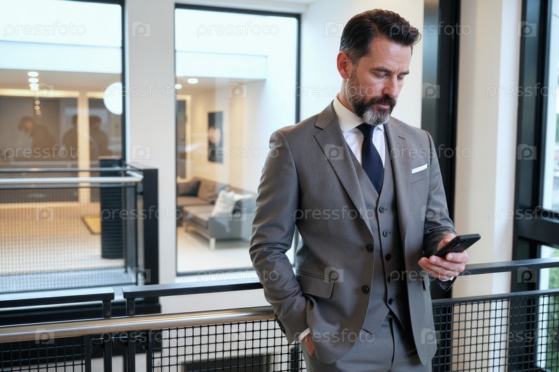 Бизнесмен средних лет проверяет смартфон в современном офисе