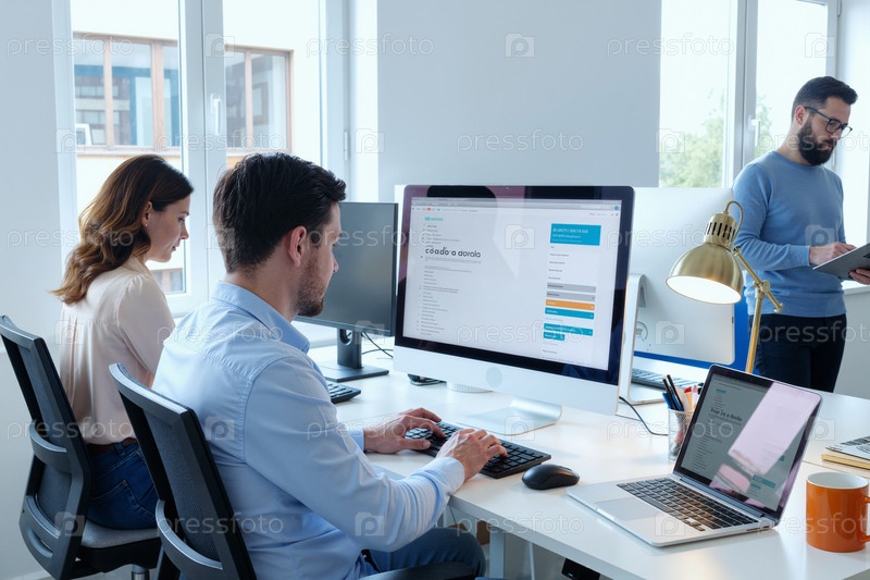 Бизнес-группа, работающая над программным проектом в современном офисе