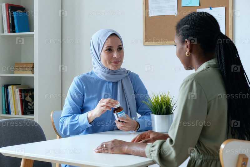 Взрослая мусульманка объясняет лекарства во время консультации с пациентом