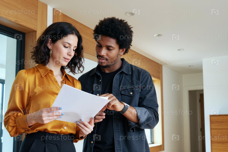 Взрослая женщина и чернокожий мужчина просматривают документы для покупки дома