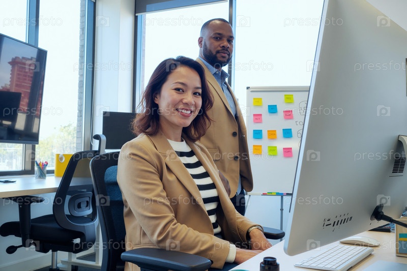 Портрет азиатской женщины, работающей с чернокожим мужчиной в офисной команде