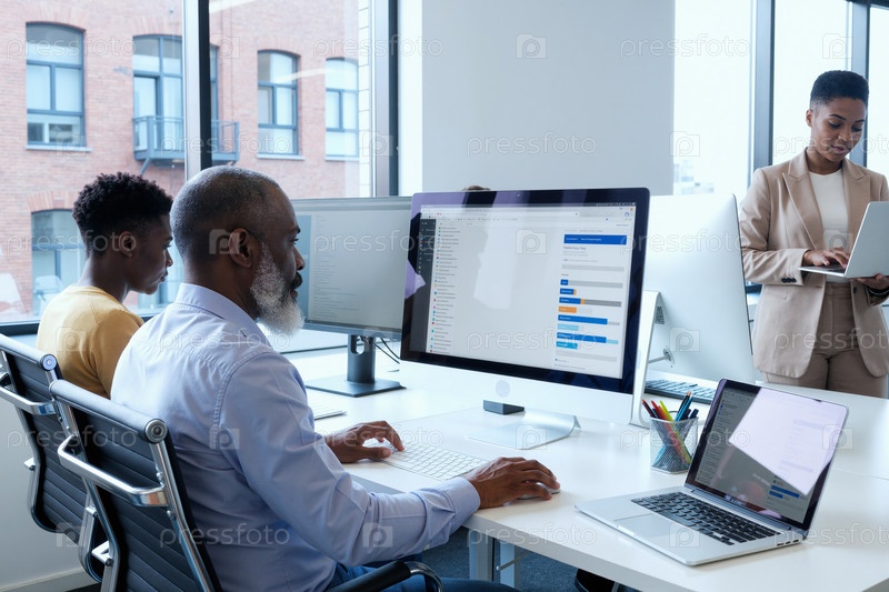 Черная бизнес-команда работает над цифровым проектом в современном офисе