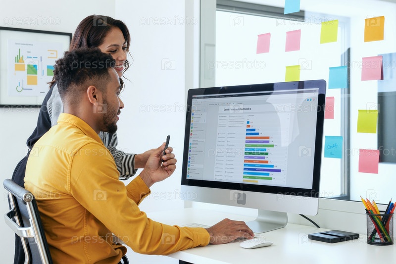 Черный мужчина и женщина просматривают панель аналитики в Office