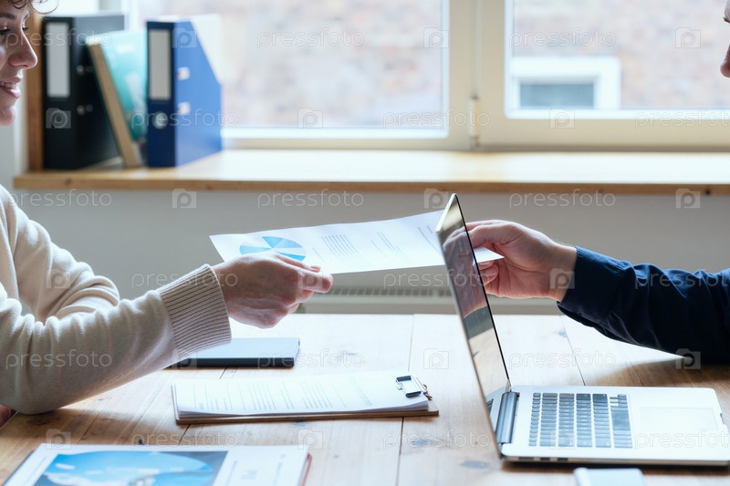 Взрослые коллеги обмениваются финансовым отчетом во время офисной встречи