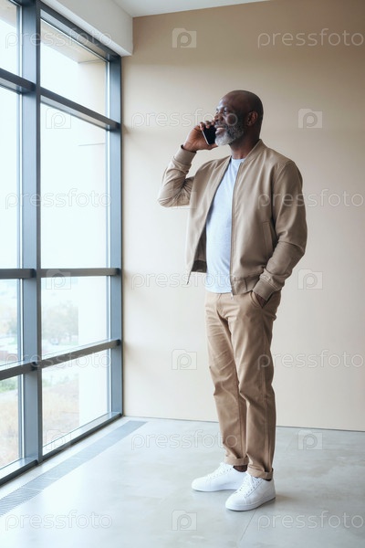 Старший чернокожий мужчина разговаривает со смартфоном во время делового звонка