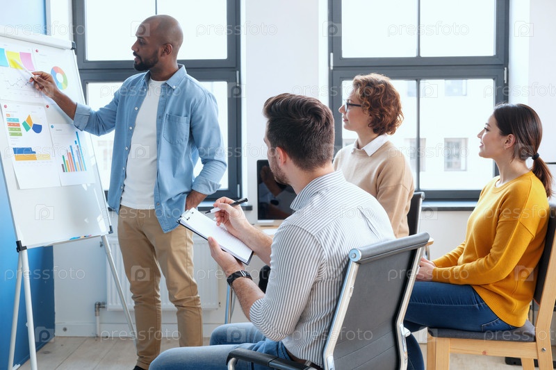 Черный человек, представляющий маркетинговую стратегию бизнес-команде в офисе