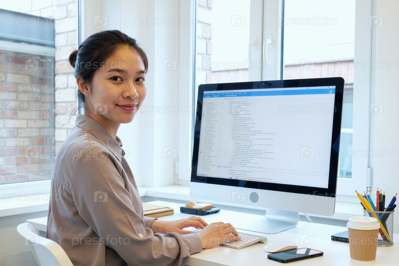 Портрет азиатской взрослой женщины, кодирующей на рабочем столе для удаленной работы
