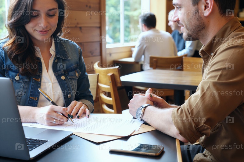 Взрослая женщина подписывает контракт во время деловой встречи с мужчиной