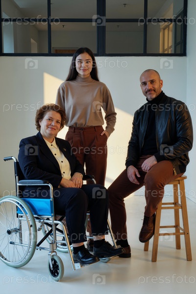 Портрет разнообразной бизнес-команды с инвалидностью, позирующей на рабочем месте