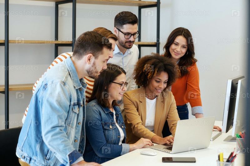 Разнообразная команда взрослых сотрудничает на ноутбуке в современном офисе